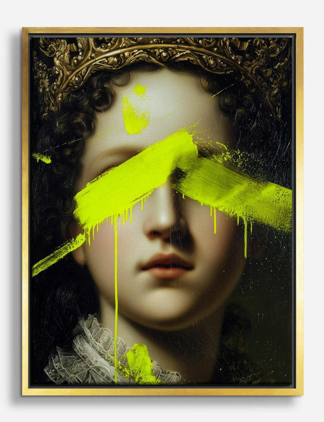Bold meets baroque in a way that’s impossible to ignore. A classic queenly portrait gets a jolt of modern attitude with electric yellow brushstrokes—instantly transforming your space into a gallery of confidence and creativity.