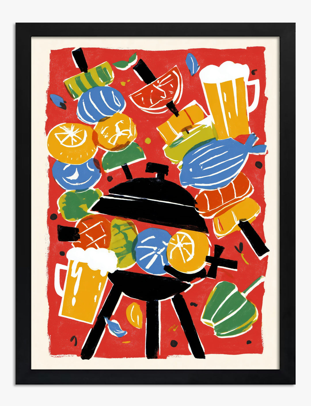 Gedurfd, fel en vol energie: deze poster maakt van je muur het hart van de zomer. Spiesjes, citrusfruit en schuimende bierpullen spatten in levendige kleuren en brengen de speelse sfeer van een barbecue in de achtertuin bij je thuis.