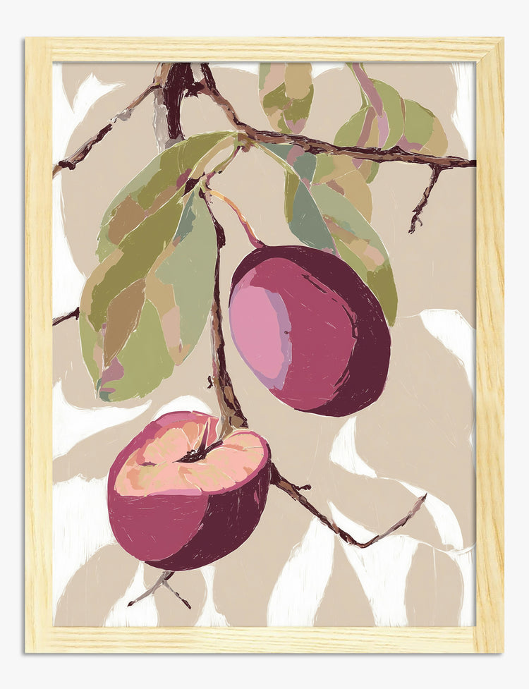 Een rustig moment, vastgelegd in zachte, aardse tinten: deze botanische poster brengt de subtiele schoonheid van de natuur in je interieur. Twee rijpe pruimen, één hele en één gehalveerde, hangen aan slanke takken. Diepe paarstinten en gedempte groentinten zorgen voor een kalme, organische uitstraling.