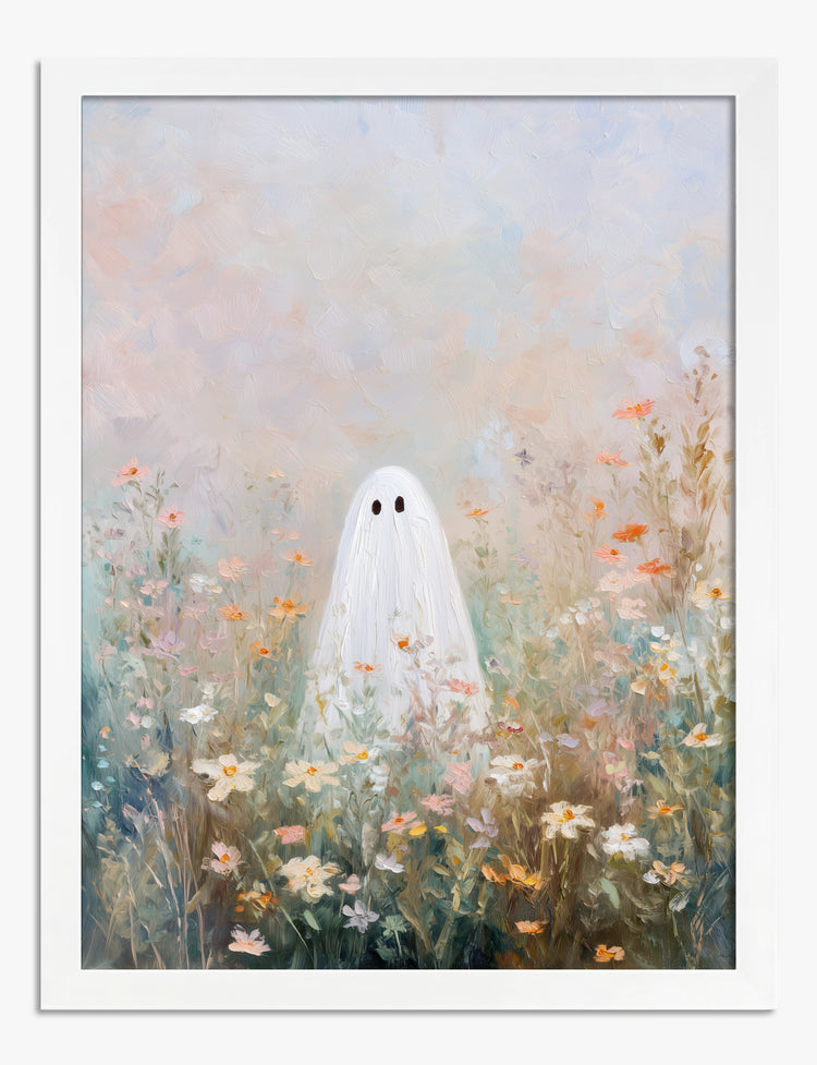 Een vriendelijke geest staat stil in een zee van wilde bloemen en brengt een gevoel van verwondering en rust in huis. Deze poster valt op door zachte pasteltinten en speelse energie, perfect voor wie houdt van een vleugje magie in het dagelijks leven.