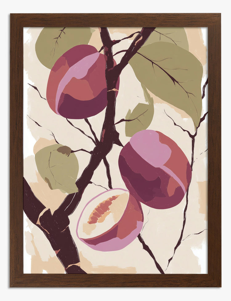 Diepgekleurde, rijpe pruimen en bladrijke takken barsten van kleur en warmte en geven je huis meteen een uitnodigende, natuurlijke sfeer. Deze poster gaat over genieten van de kleine luxe van het leven—zoals zonlicht dat door fruitbomen valt of een stil moment met de natuur—gewoon bij jou thuis.