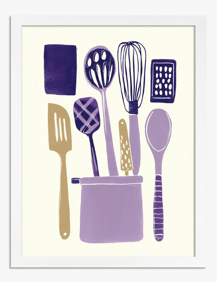 Elke keuken vertelt een verhaal – maak dat van jou stijlvol met deze speelse illustratie van alledaags keukengerei. Zachte lavendel- en diep pruimpaarse tinten komen mooi uit tegen een romige achtergrond en geven je ruimte een frisse, moderne uitstraling.