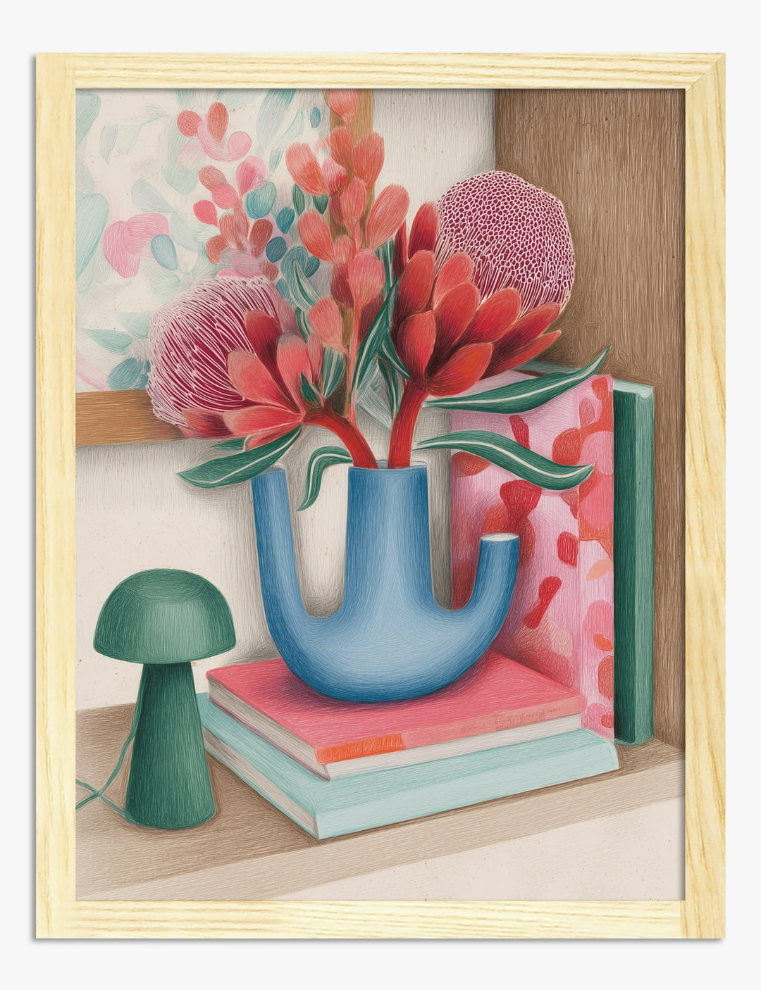 Krachtige kleuren ontmoeten speelse vormen in dit fantasierijke stilleven. Koraal en groen spatten uit een sculpturale blauwe vaas, terwijl losjes gestapelde boeken en een eigenzinnige lamp uitnodigen tot creativiteit in je dagelijkse routine. Deze poster geeft elke ruimte direct energie en maakt je planken of bijzettafels helemaal eigen.