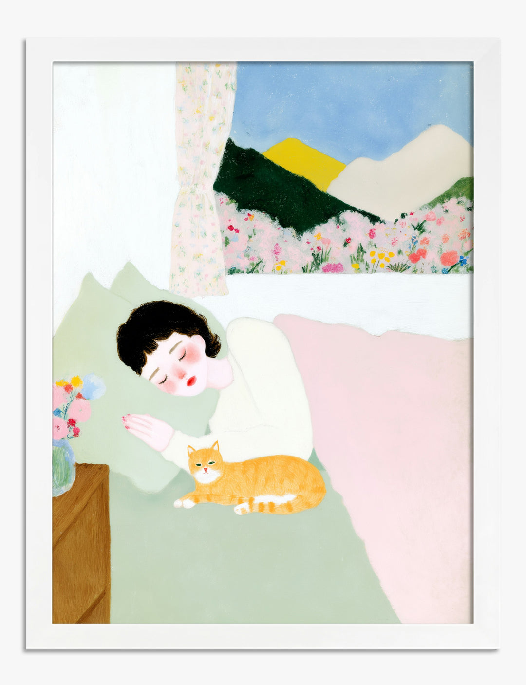 Er is iets magisch aan wakker worden met zonlicht en een zachte vacht naast je. Deze tedere illustratie legt het knusse geluk van een stille ochtend vast, waarbij elk detail, van rozige wangen en een spinnende kat tot de bergen achter het raam, uitnodigt om te vertragen en van het moment te genieten.