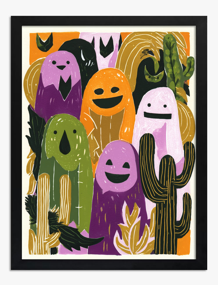 Stap in een wereld waar vriendelijke geesten de magie van de woestijn ontmoeten. Deze kleurrijke, glimlachende figuren geven elke muur persoonlijkheid en een vleugje eigenzinnige speelsheid, waardoor je ruimte direct levendiger aanvoelt.