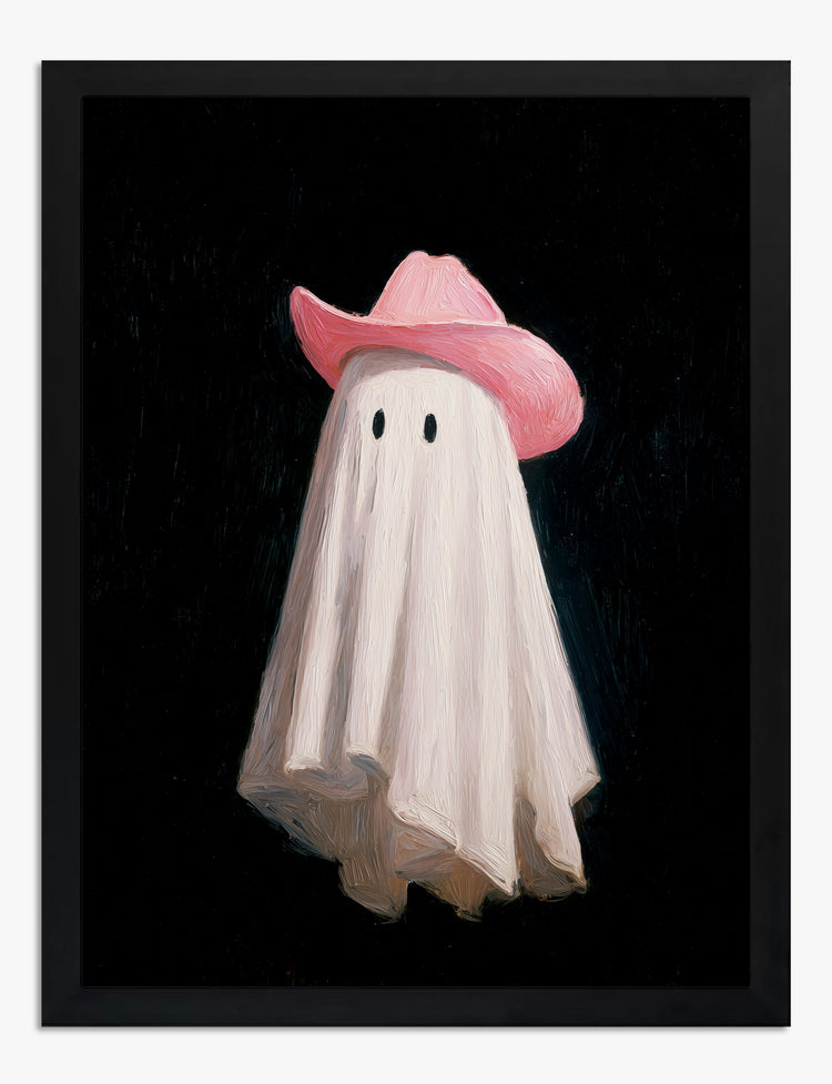 Is het een spook, of je nieuwe favoriete gesprekstarter? Dit speelse werk geeft je muren een knipoog van westerncharme en een vleugje Halloweenplezier. Het vriendelijke spook, gehuld in klassiek wit en met een kauwgomroze cowboyhoed, is de perfecte mix van eigenzinnig en cool.