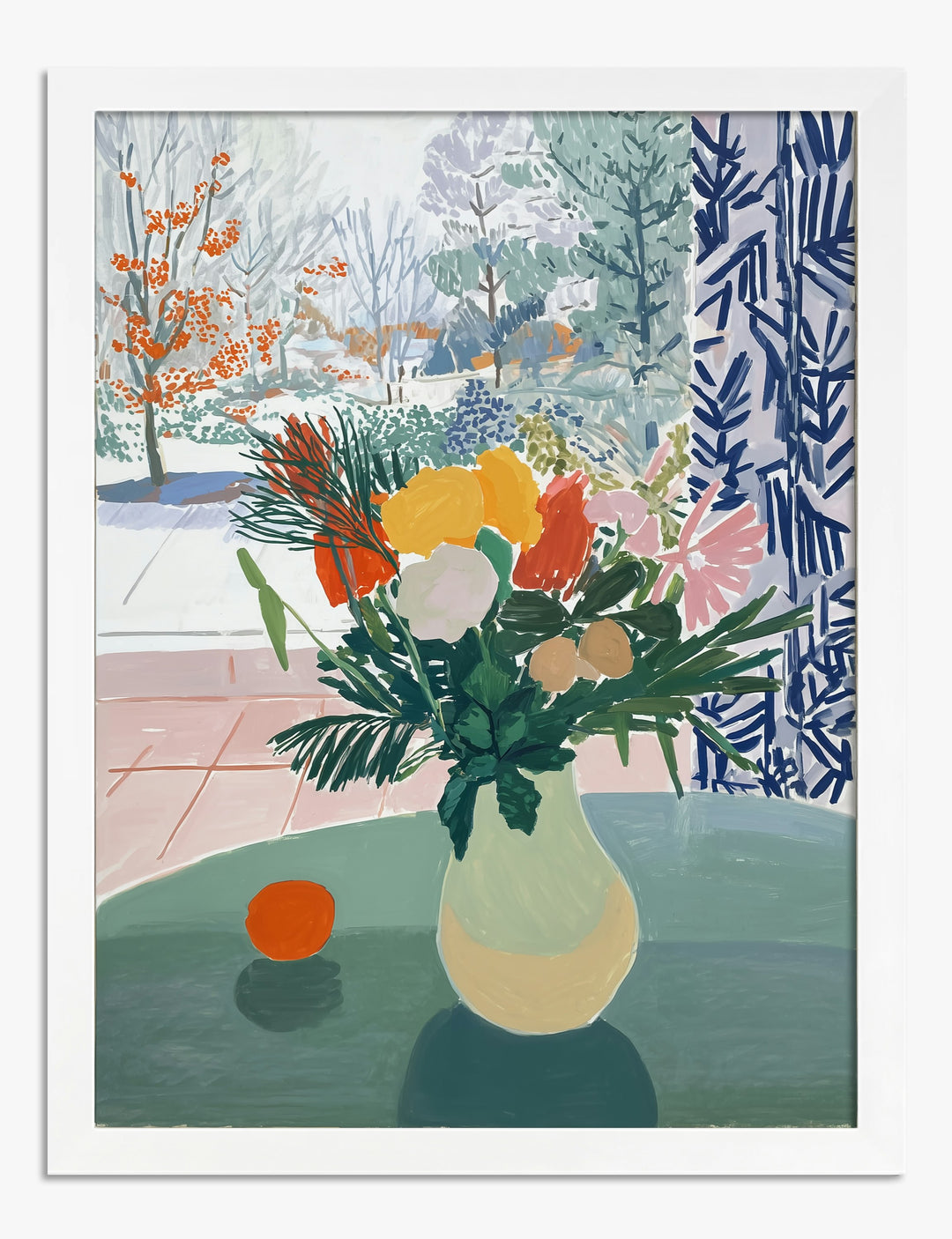 Frisse kleuren en speelse energie komen samen in dit levendige bloemenstilleven. Een vaas vol tuinverse bloemen staat centraal, terwijl een zonovergoten raam het buiten naar binnen haalt en de grens tussen het huiselijke comfort en de schoonheid van de natuur vervaagt.