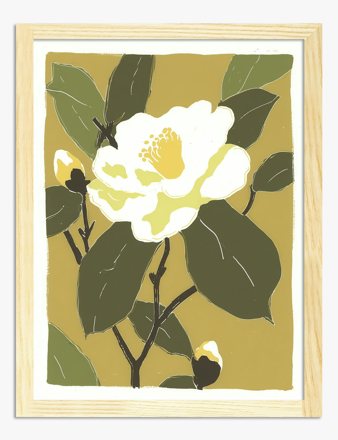 Een enkele witte camelia, krachtig en sereen, springt eruit tegen een warme, gouden achtergrond – als een frisse bries voor je muren. Deze poster verzacht elke ruimte direct en brengt een subtiel vleugje natuur naar binnen, zonder ooit druk of overdadig te ogen.