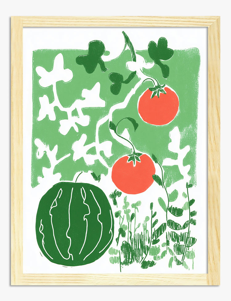 Krachtige vormen en frisse kleuren brengen een flinke dosis tuinvreugde in je interieur. Dit speelse werk vangt de eenvoudige magie van rijpe tomaten en watermeloen en maakt van alledaagse groente en fruit een kunstwerk.