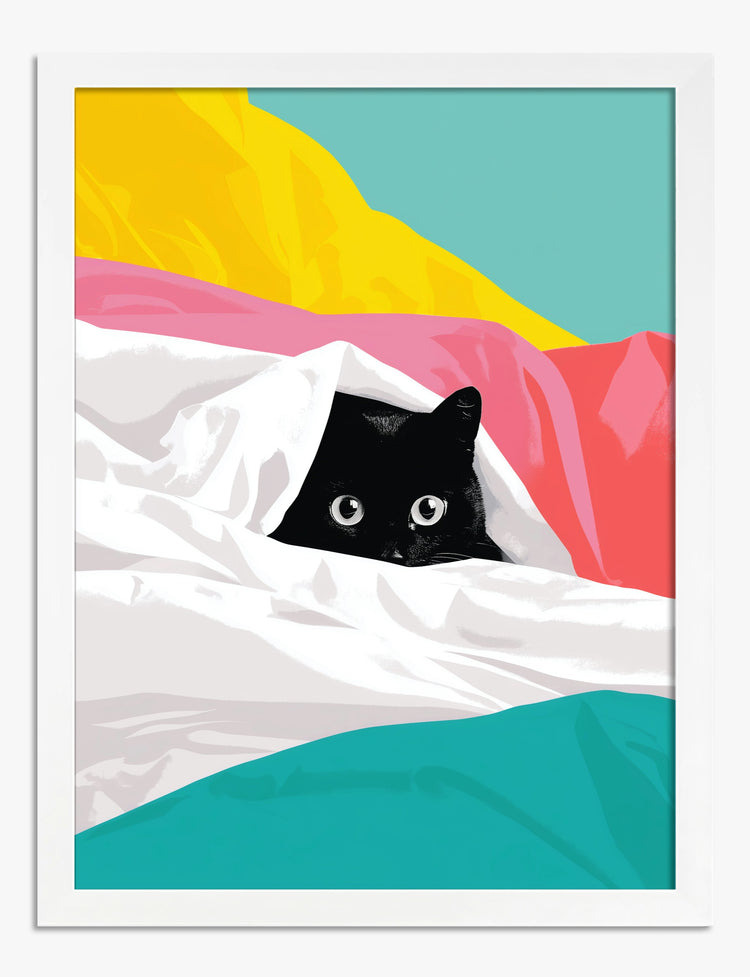 Een nieuwsgierige zwarte kat duikt op uit een wervel van snoepkleurige lakens en geeft je muren meteen een speels karakter. Deze poster is puur plezier en brengt een vleugje luchtige charme in elke ruimte die wel wat kleur en een glimlach kan gebruiken.