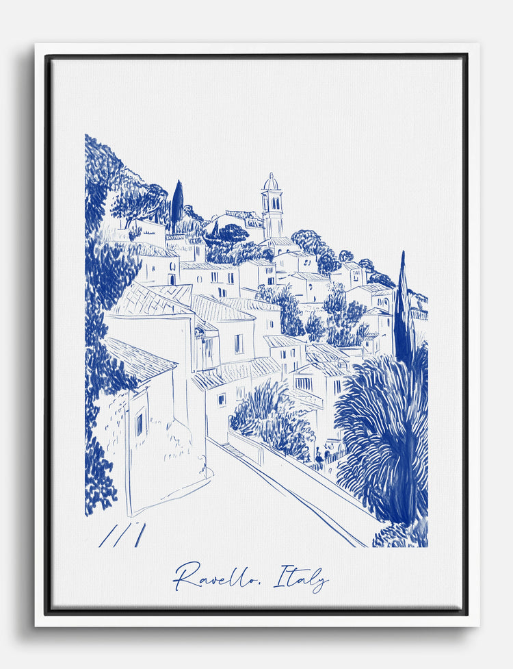 Embrace the charm of Italy with this elegant line drawing of Ravello. The intricate blue lines capture the essence of a serene hillside village, bringing a touch of Mediterranean tranquility to your space. Perfect for a cozy living room or a sophisticated office, its crisp blue tones blend effortlessly with modern or minimalist decor. Transform your walls into a beautiful escape, where every glance reminds you of sunlit adventures and timeless elegance.