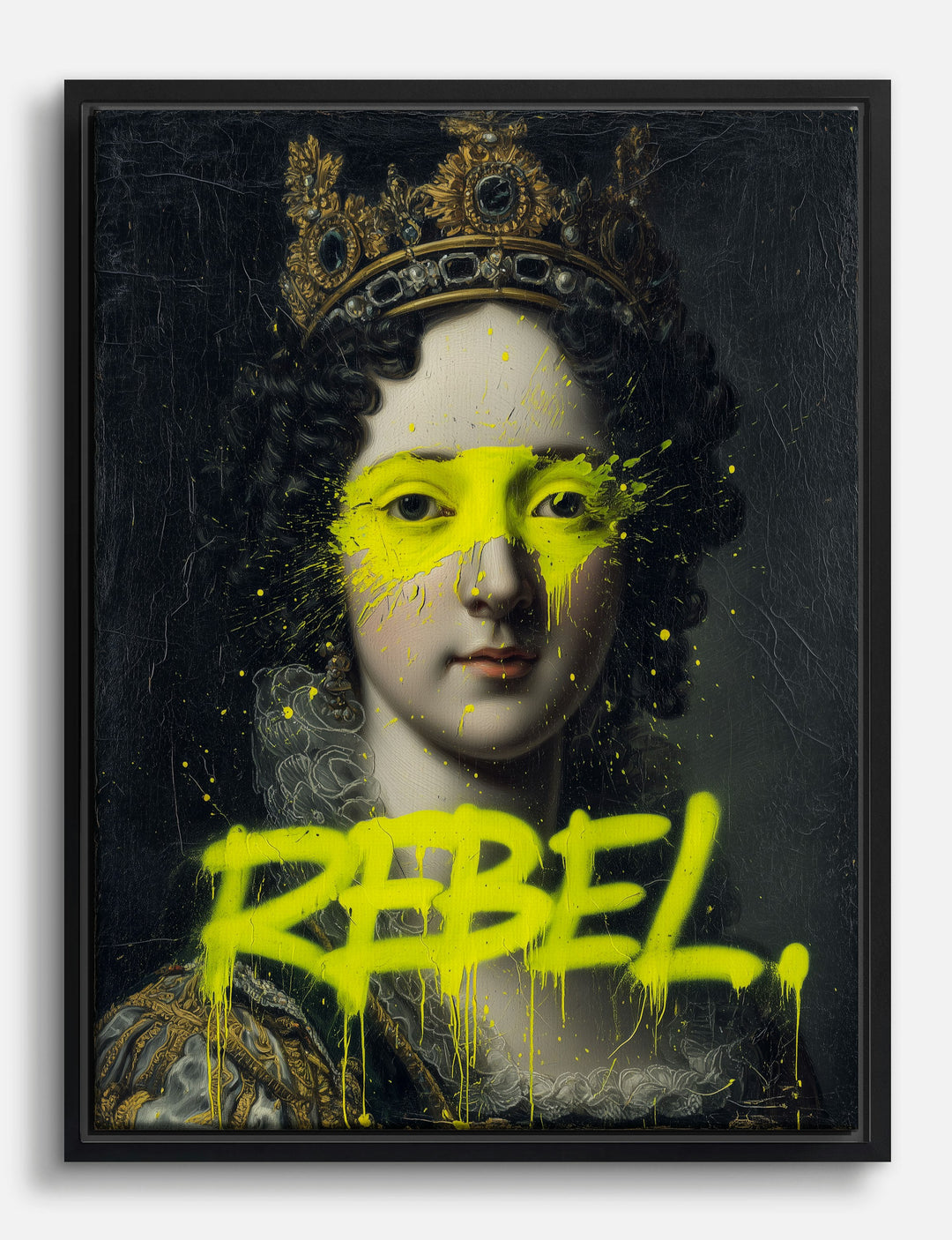 Make your walls shout your story with this unapologetically bold portrait. A regal beauty, crowned and elegant, gets a rebellious twist with bright yellow graffiti and a fearless mask—reminding you that true royalty is about breaking the rules and owning your space.