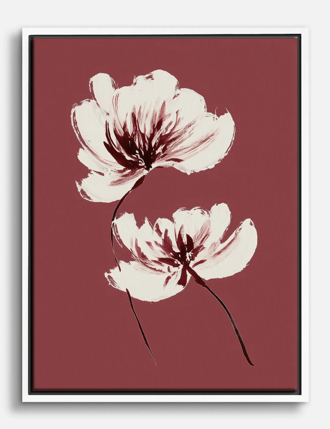 Bold yet serene, this floral duo brings a breath of fresh elegance to any wall. The soft brushstrokes and delicate petals create a gentle energy, perfect for infusing your living room or bedroom with a sense of calm and effortless style. Let your space bloom with understated confidence—these flowers stand out against a rich, rosy backdrop, making them a stunning match for both modern and classic decor. Youll love how the warm tones play off neutral furnishings or pop against deeper hues. Transform your home into a haven of self-expression. With this unique piece, its easy to add a touch of sophistication and warmth, all while making your space feel truly yours.