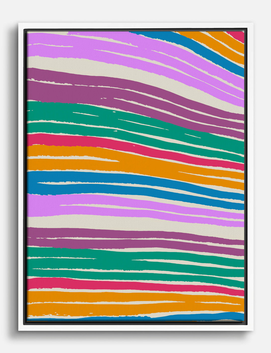 Color takes center stage with this lively, free-spirited piece. Bold, hand-drawn stripes in pinks, greens, oranges, and blues sweep across the canvas, instantly energizing any room. It’s like a celebration of color that never gets old.