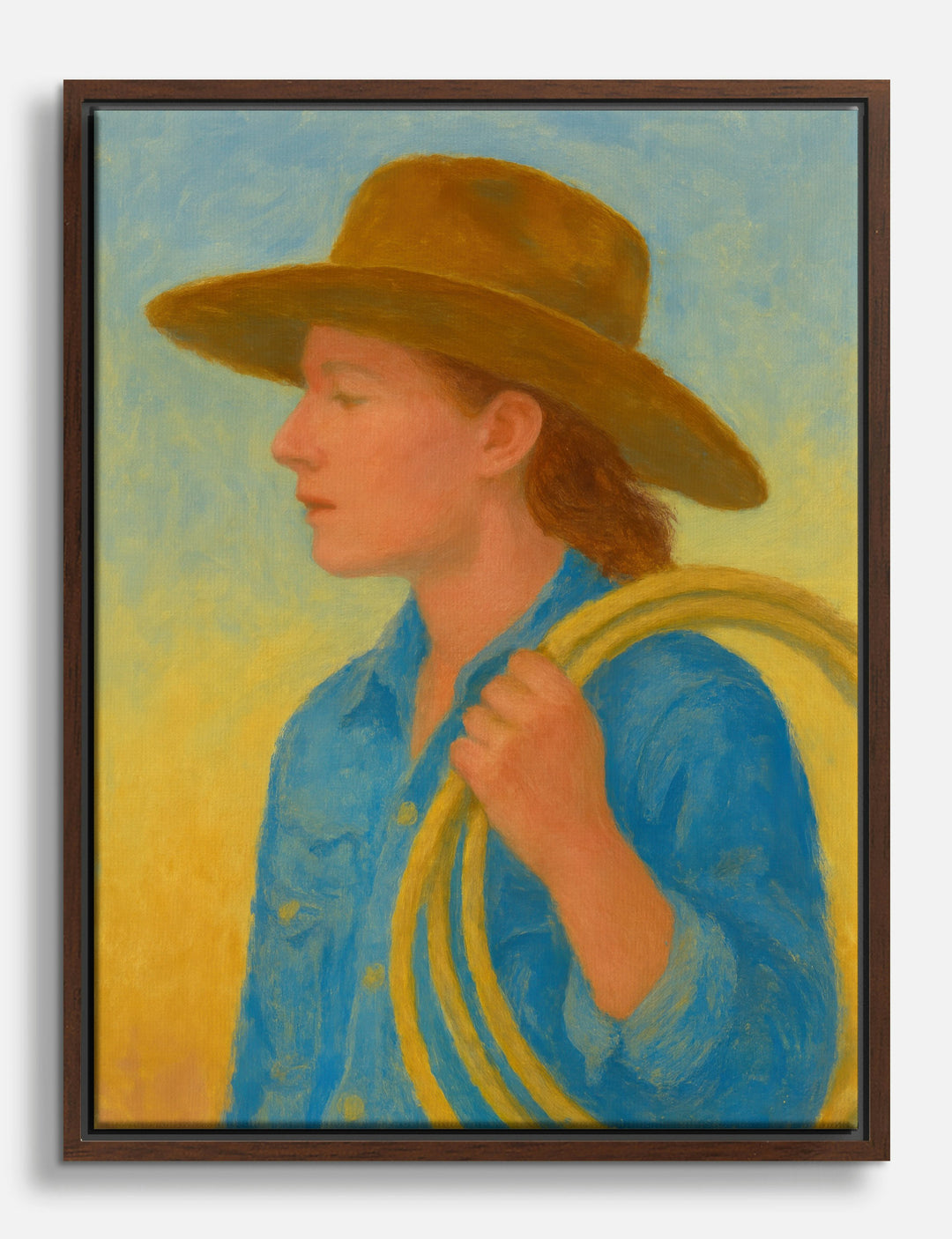 Step into the serene world of the West with this captivating portrait. The gentle hues of blue and brown create a calming atmosphere, perfect for your living room or study. Let this piece inspire a sense of adventure and freedom, adding a touch of rustic charm to your home. Its warm palette effortlessly complements various decor styles, making it a versatile choice for transforming your space.