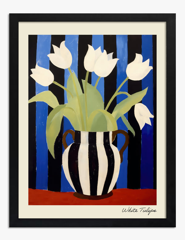 Poster gestreepte vaas met witte tulpen