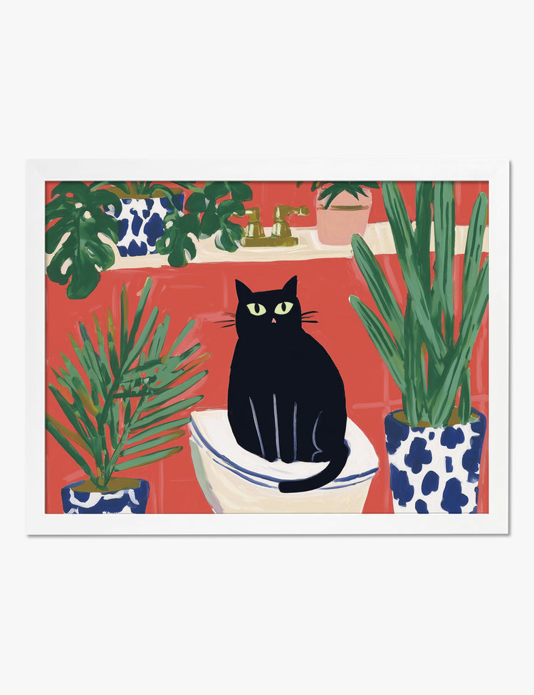A bold black cat perched among lush green plants brings instant personality to your walls. This playful scene pops with a modern twist—think striking color, graphic shapes, and a dash of feline attitude. You’ll love how the rich reds and deep greens energize any space, making it perfect for your bathroom, bedroom, or even a quirky office nook. The fun, contemporary vibe fits right in with eclectic, modern, or boho decor. Let this piece remind you: style should feel effortless and a little unexpected. Every glance is a spark of joy—proof that your home is as unique as you are.