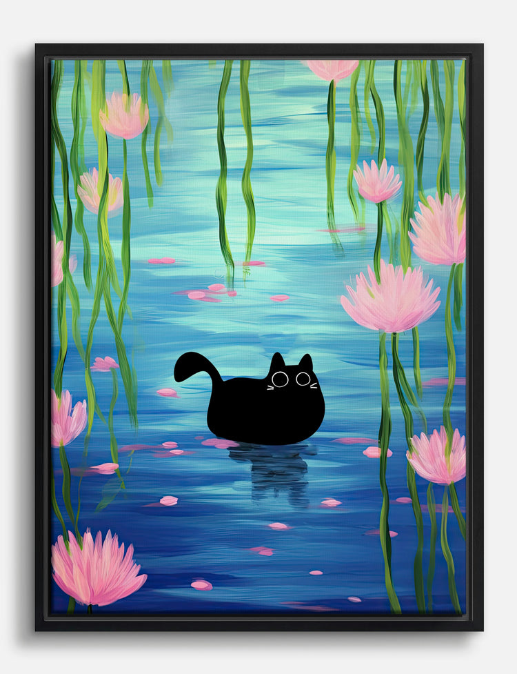 Dive into a world of whimsy with this enchanting artwork. A playful black cat floats amidst serene pink blooms, inviting tranquility and charm into your space. Perfect for a bedroom or living room, this piece harmonizes beautifully with both modern and eclectic decor. Let it inspire joy and a touch of magic every day.