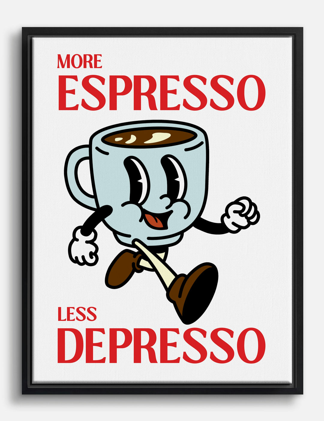 Start your day with a wink and a smile—this playful print brings a burst of caffeinated cheer to any wall. The retro cartoon coffee cup, full of personality, radiates positivity and charm, making every morning feel lighter. Whether it’s brightening up your kitchen or adding a pop of fun to your office, its bold black, white, and red palette complements both modern and eclectic decor.