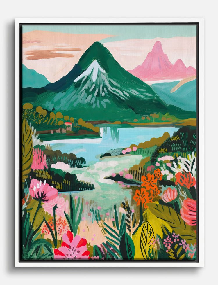 A rush of wildflowers and bold, sweeping color instantly transforms your space into a joyful escape. This lush mountain scene brims with life, inviting you to breathe deep and feel at ease—right in your living room or bedroom. The rich greens, playful pinks, and serene blues pop against any decor, making your home feel fresh and uniquely yours. Let this piece be your daily reminder that your sanctuary can be both inspiring and effortlessly stylish.