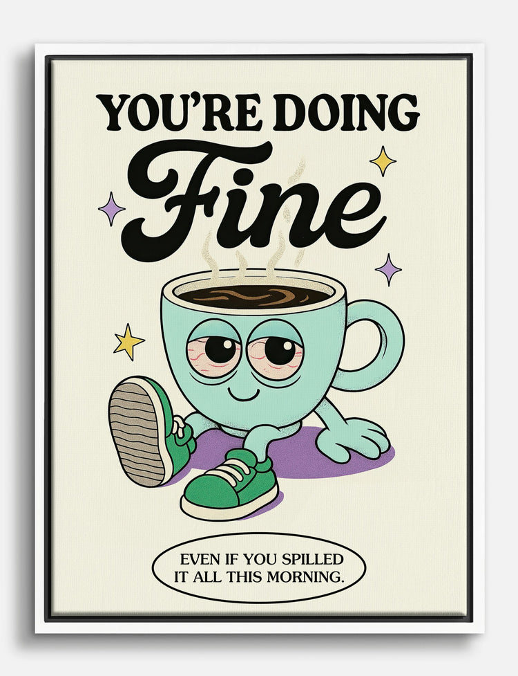 Ever have one of those mornings where nothing goes right? This playful print is here to remind you: you’re still doing just fine. With its cheerful cartoon coffee cup, laid-back sneakers, and a splash of retro style, this piece instantly adds warmth and a wink to your walls.