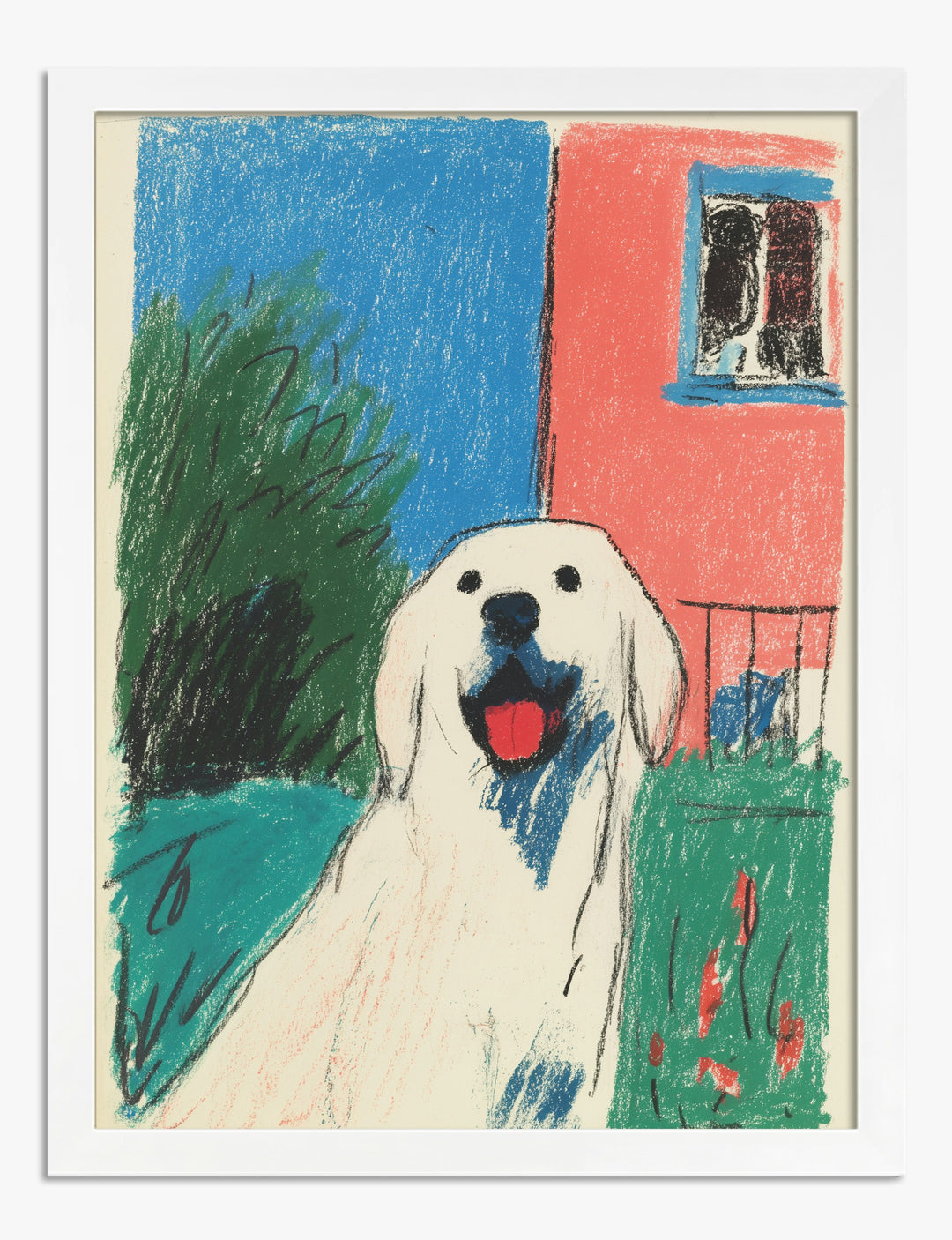 A burst of pure happiness, this playful pup brings instant warmth and charm to any wall. The hand-drawn style and bold colors capture the energy of a golden retriever basking in a sunny backyard—tail wagging, tongue out, and ready to brighten your day.