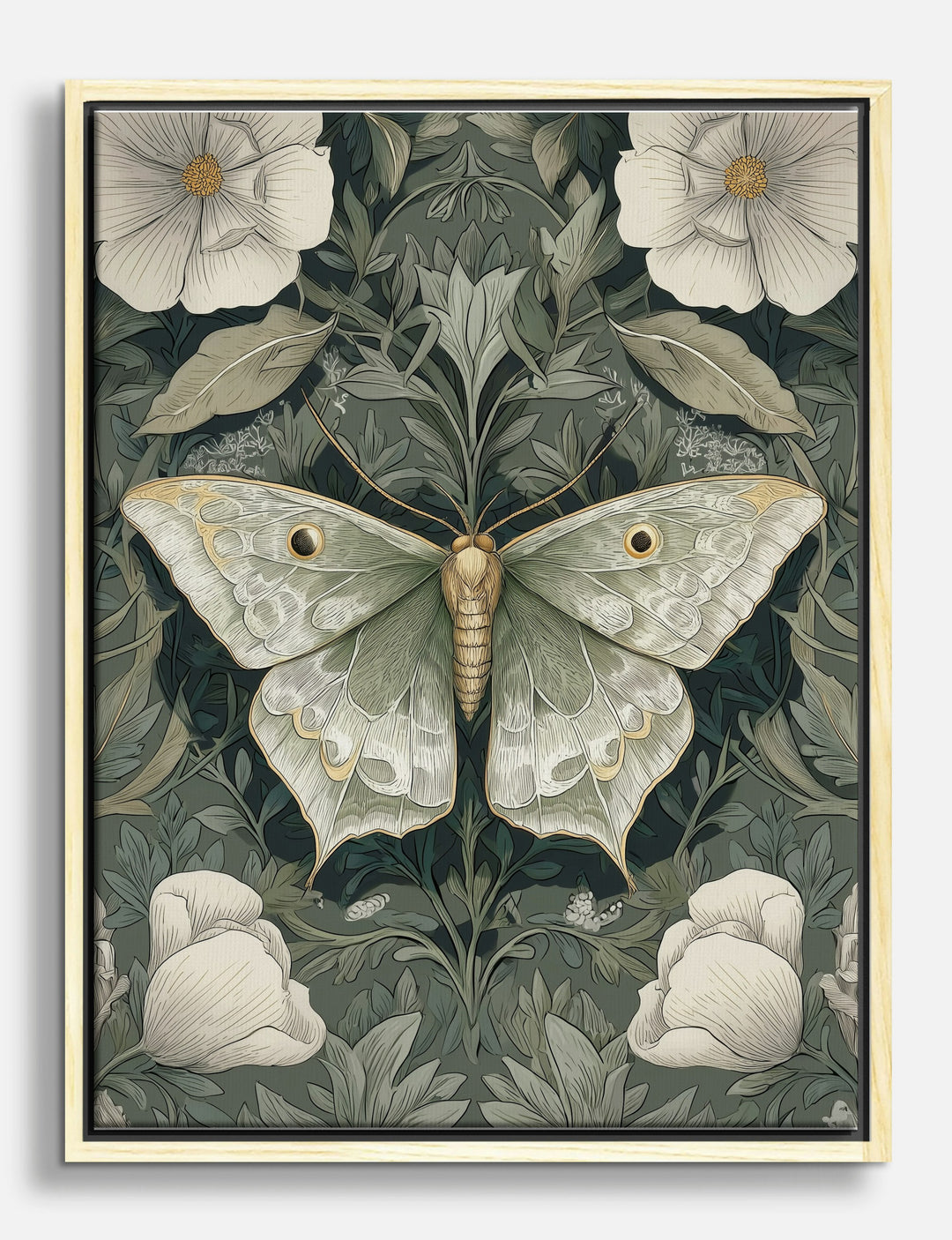 Let your walls flutter to life with this enchanting moth surrounded by delicate, vintage florals. The soft sage greens and creamy whites instantly create a calming vibe, making any room feel like a peaceful retreat.