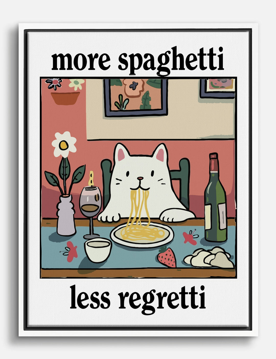 Who says dinner can’t be a delight? This playful white cat, savoring a plate of spaghetti with pure joy, instantly brings warmth and whimsy to your kitchen or dining space. The retro diner vibes, cozy pastels, and cheeky “more spaghetti less regretti” motto make every meal feel like a celebration.