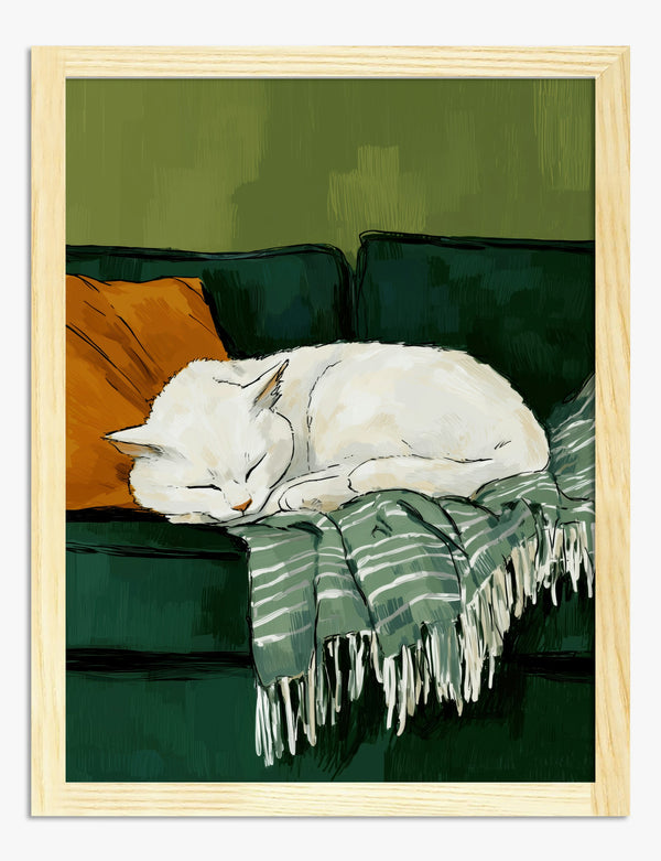 Poster slapende witte kat op groene bank