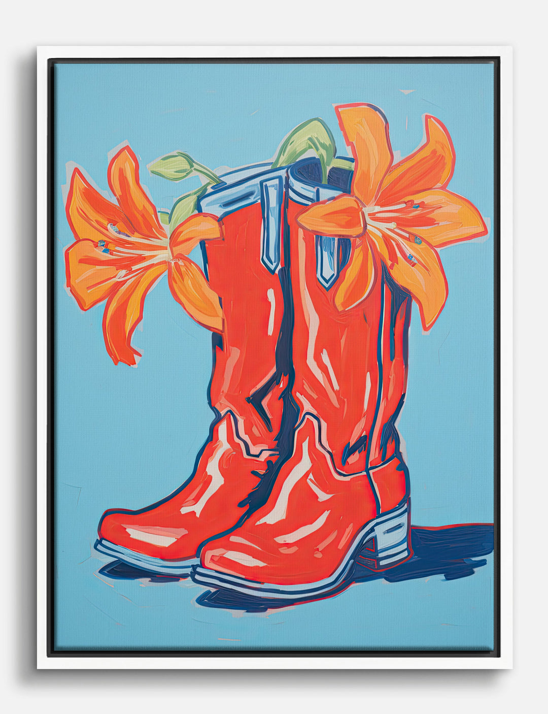 Step into a world where style meets whimsy with this vibrant artwork. The bold red cowboy boots, adorned with striking orange flowers, bring a playful pop of color to any room. Perfect for your living room or entryway, this piece effortlessly blends rustic charm with modern flair. Let it be a conversation starter and a symbol of your unique taste.
