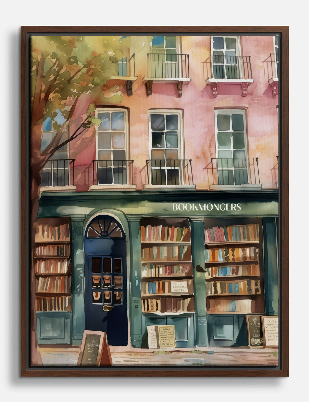 Step into a world where stories come alive with this delightful bookshop artwork. Perfect for your living room or study, it adds a touch of literary charm and warmth to any space. The soft color palette of pinks and greens complements a variety of decor styles, inviting you to get lost in the pages of your imagination. Transform your home into a haven of inspiration and style effortlessly.