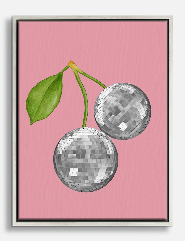 Two sparkling disco balls masquerading as cherries bring instant party vibes to your space. The playful blend of glossy silver and lush green pops against a soft pink background, promising to brighten any wall. Hang this in your living room or bedroom and let it inspire a sense of fun, confidence, and a little bit of retro glam. With its versatile color palette, youll find it effortlessly elevates everything from modern minimalism to bold, eclectic decor.