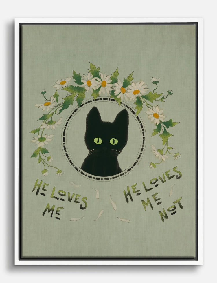 Step into a world of whimsy with this delightful piece, where a mysterious black cat peeks through a wreath of daisies, pondering those timeless words: He loves me, he loves me not. This charming artwork is perfect for your bedroom or living room, adding a touch of vintage magic to your decor. The muted green and black palette effortlessly complements any style, inviting a sense of warmth and playful curiosity into your home.