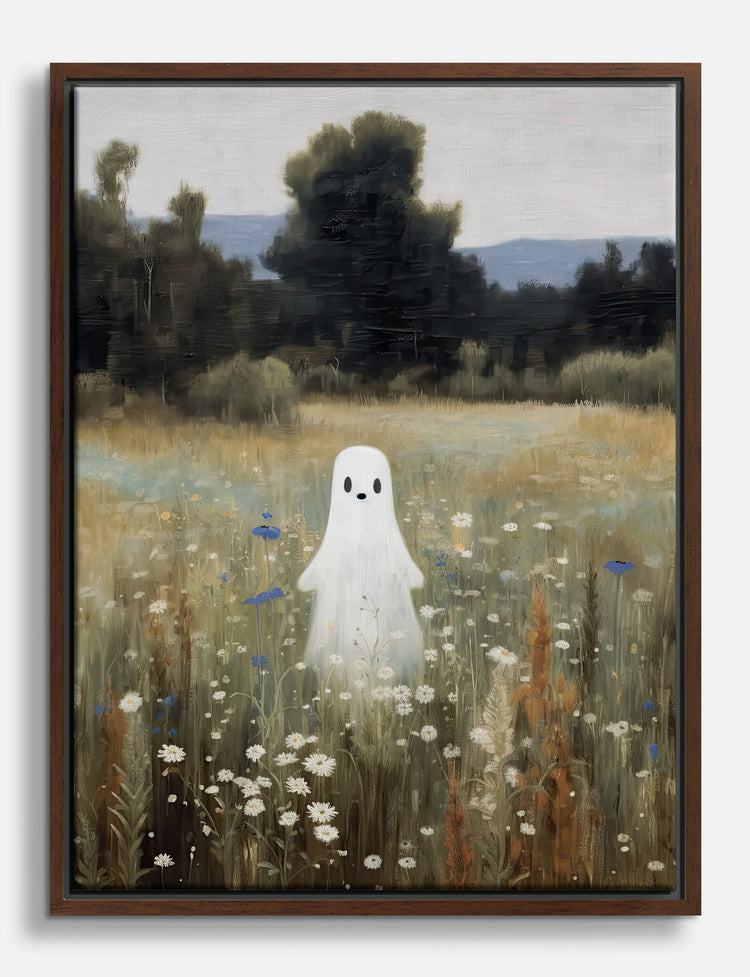 Step into a world where the ethereal meets the everyday with this charming ghost in a wildflower meadow. Perfect for adding a touch of whimsy to your space, this piece effortlessly blends vintage vibes with a playful twist. Hang it in your living room or bedroom to create a cozy, inviting atmosphere that sparks joy and conversation. The muted, earthy tones complement a variety of decor styles, making it easy to transform your home with personality and charm.