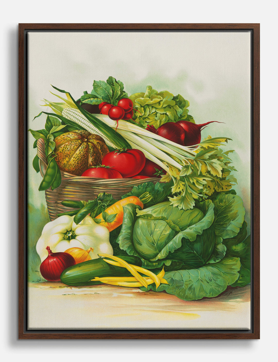 A celebration of abundance, this vintage-inspired still life brings a fresh market vibe right into your home. Overflowing with vibrant greens, golden squash, and garden-fresh reds, each detail pops with warmth and nostalgia.