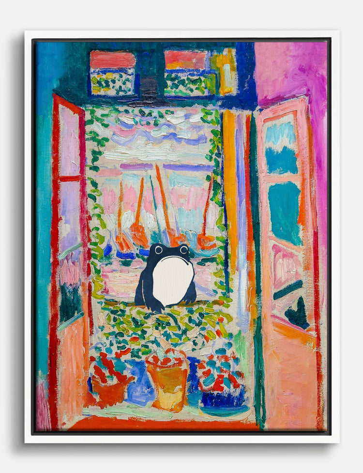 What if a touch of playful charm could instantly brighten your day? With its bold, sun-washed colors and a delightfully unimpressed frog perched in a dreamy window, this piece brings both humor and high style to your space. Picture it in your living room or bedroom, where its vibrant palette pops against neutrals or adds energy to colorful decor.