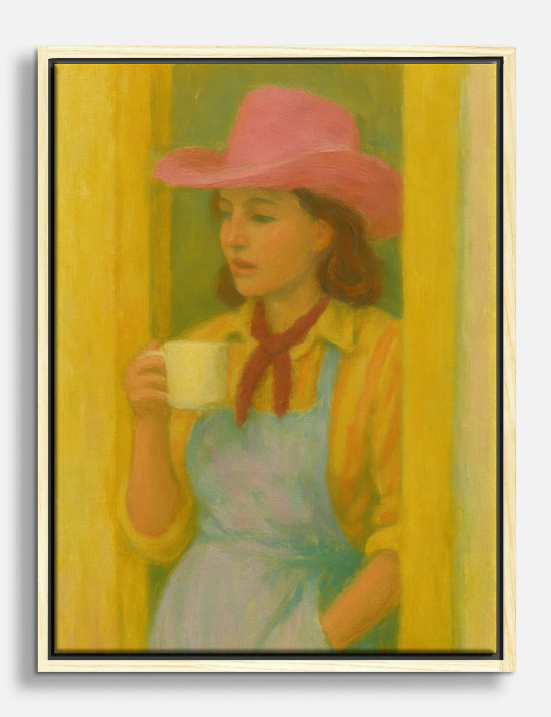 Embrace a moment of calm with this inviting piece. A woman in a soft pink hat, sipping her morning coffee, adds a touch of warmth to any room. The gentle hues of yellow and pink create a cozy atmosphere, perfect for your kitchen or dining room. Let this artwork inspire a sense of relaxation and style in your home, effortlessly blending with both modern and vintage decor.