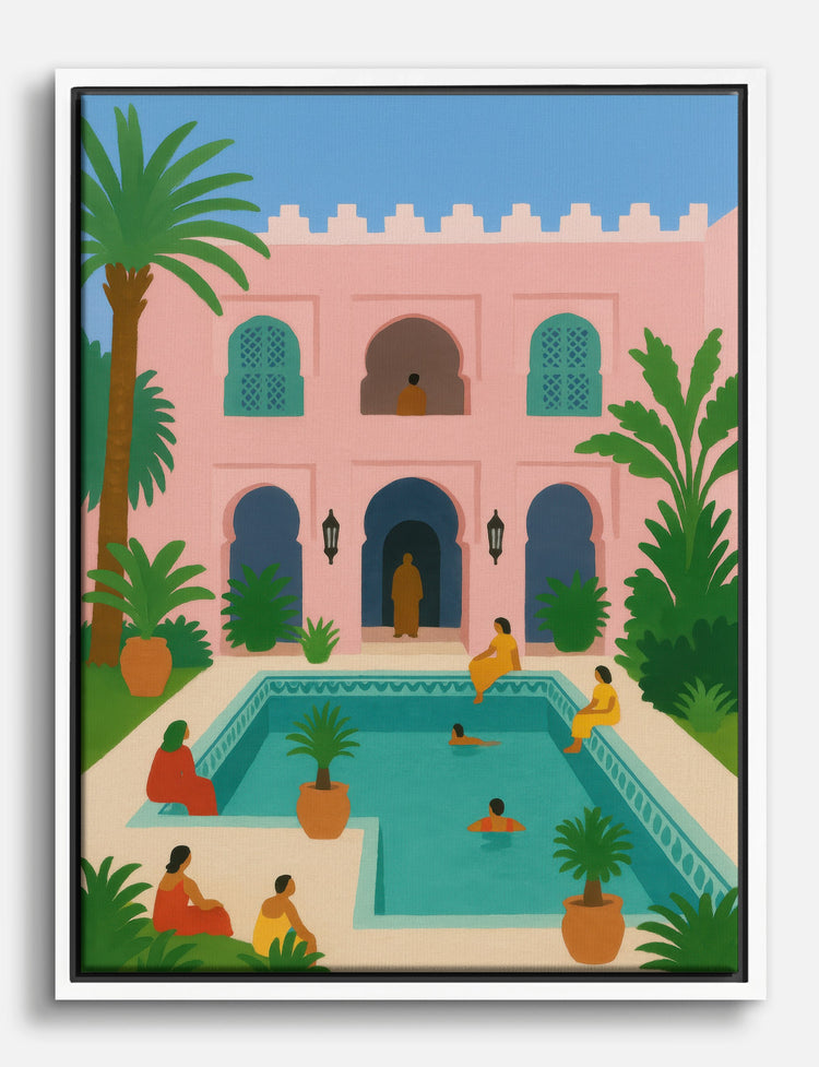 Step into your own sun-drenched retreat—this piece brings the magic of a Moroccan courtyard right into your home. Lush palms, playful pastels, and a sparkling pool invite you to linger and dream. It’s an instant mood-lifter, perfect for brightening your living room or bedroom with effortless style.
