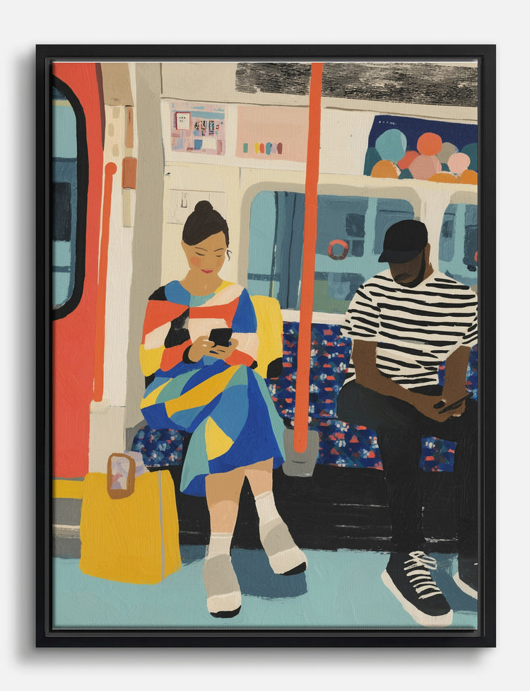 Bold color meets everyday life in this vibrant snapshot of city living. Two commuters, lost in their own worlds, share a quiet moment on the subway—bringing a sense of calm and connection to your space.