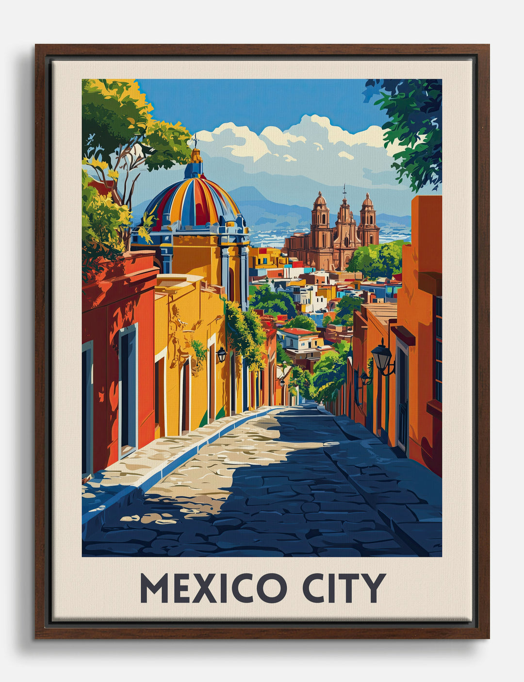 Immerse yourself in the vibrant hues and architectural charm of Mexico City with this captivating art piece. Let the rich colors and iconic skyline transport you to a place of cultural wonder. Perfect for your living room or study, this artwork complements both modern and vintage decor, infusing your space with a sense of adventure and pride.