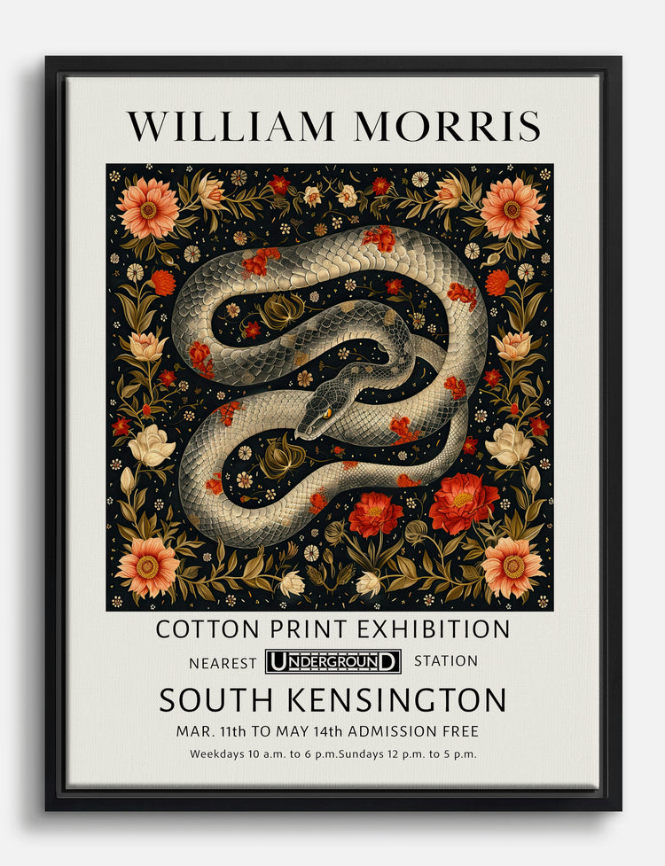 Looking for a bold way to express your style? This William Morris-inspired piece weaves vintage charm with a modern edge, featuring a striking serpent coiled among lush blooms. The rich blacks and warm florals pop against any wall, making it a conversation starter in your living room or a dramatic accent in your bedroom.