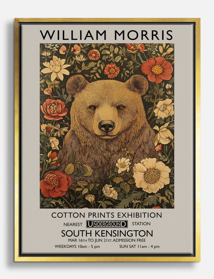 Step into a world where nature meets artistry with this captivating piece inspired by William Morris. The bear, nestled among lush florals, brings a touch of whimsy and warmth to your space. Perfect for your living room or bedroom, this artwork harmonizes effortlessly with a variety of decor styles, adding a unique, stylish flair. Let it transform your home into a haven of beauty and comfort, all at an accessible price.