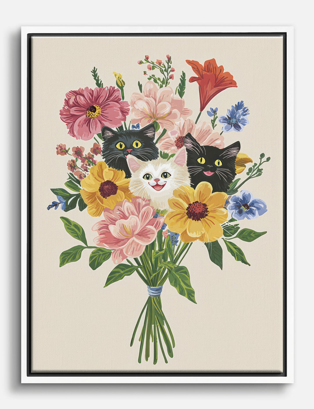 Three curious cats peek playfully from a lush bouquet of wildflowers, adding a spark of delight to any room. This piece is a celebration of personality and color—perfect for anyone who believes home should feel joyful and a little unexpected.