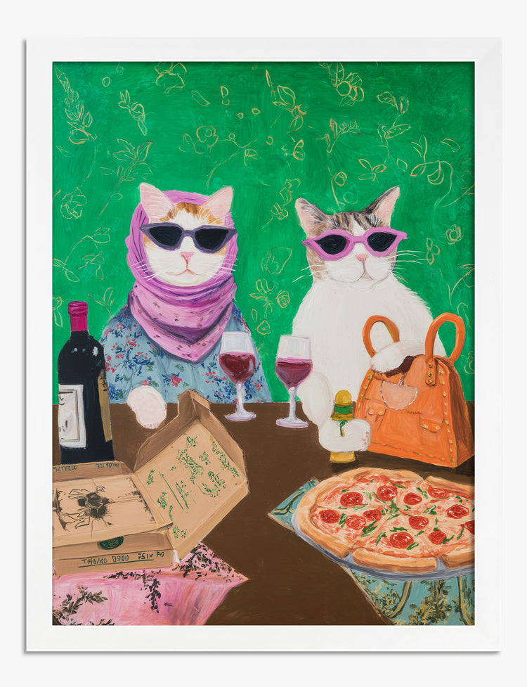 Step into a world where style and playfulness meet—two fabulously dressed felines in sunglasses, sharing pizza and wine, bring instant joy and charm to any wall. This piece radiates quirky sophistication, making it perfect for anyone who loves a little fun with their flair.