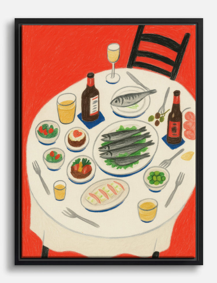 Pull up a chair—this lively table scene is all about togetherness and everyday delight. A playful mix of grilled fish, fresh salads, and cheerful drinks instantly energizes your dining room or kitchen, inviting conversation and connection. The warm reds and soft neutrals pop against any backdrop, making every meal feel a little more special.