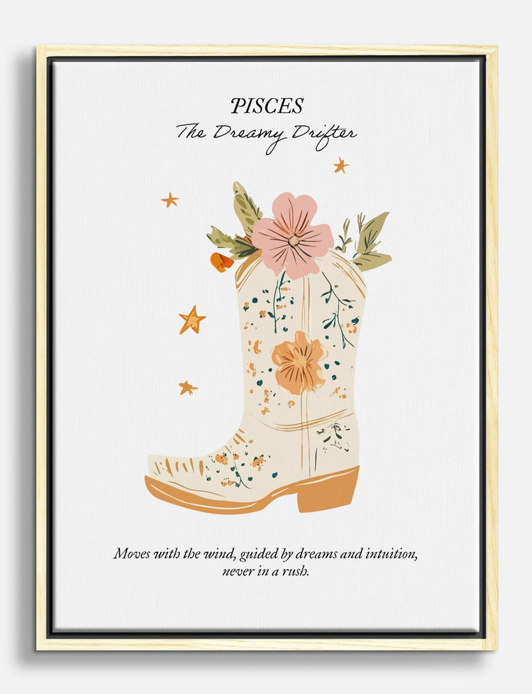 Like a gentle breeze whispering through wildflowers, this Pisces-inspired piece invites a sense of dreamy wonder into your space. The soft, floral-embellished cowboy boot and playful stars set a mood that’s equal parts whimsical and serene. Perfect for your bedroom or cozy reading nook, it brings a touch of magical calm—and a reminder to move with your own rhythm. Let your walls reflect your intuition and style with this effortlessly unique accent.