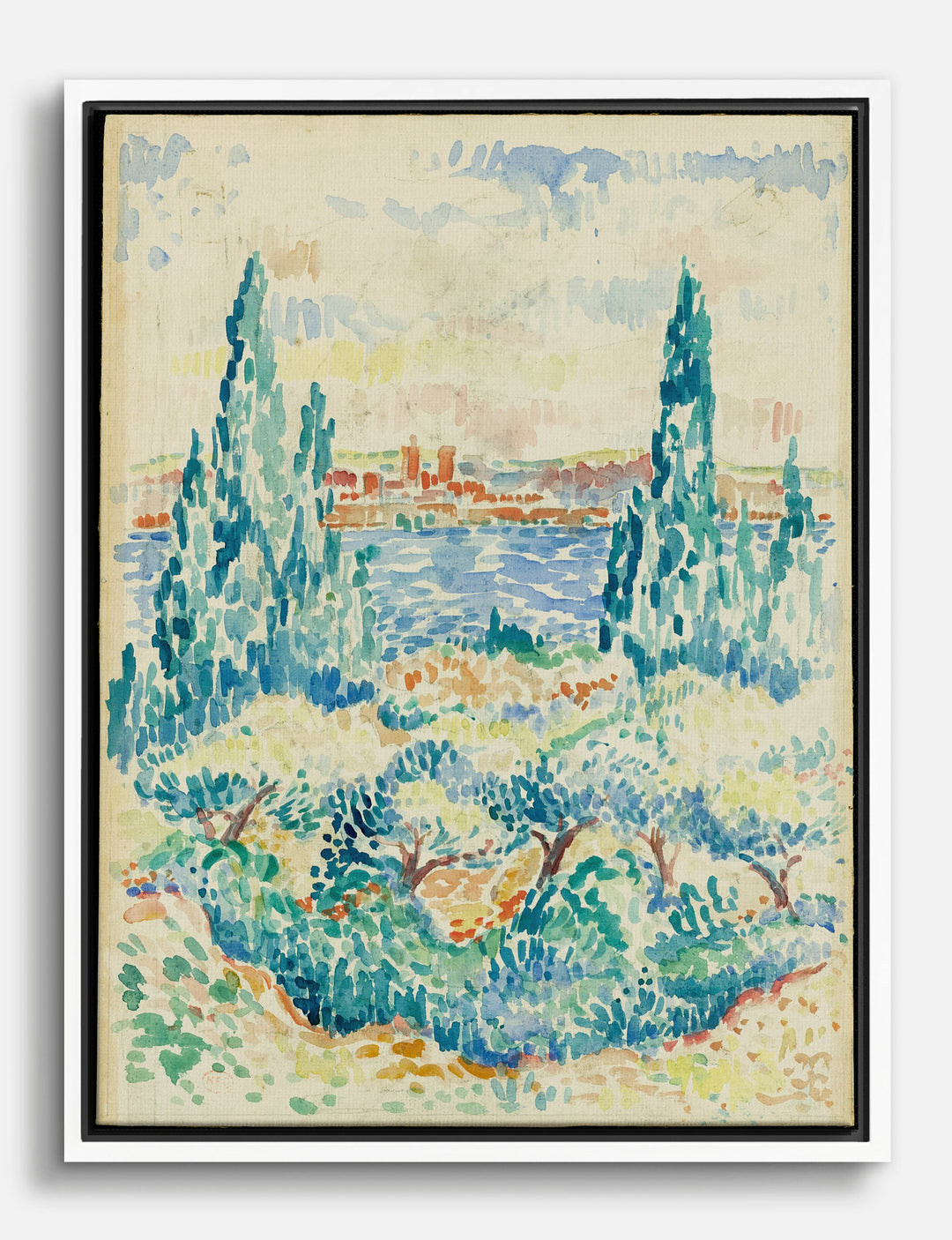 A breath of sunlit tranquility, this Henri Edmond Cross piece brings the lush Mediterranean right into your space. Swirling brushstrokes in cool blues and vibrant greens capture the gentle shimmer of water and the peaceful rhythm of cypress trees, inviting you to pause and soak in the calm.