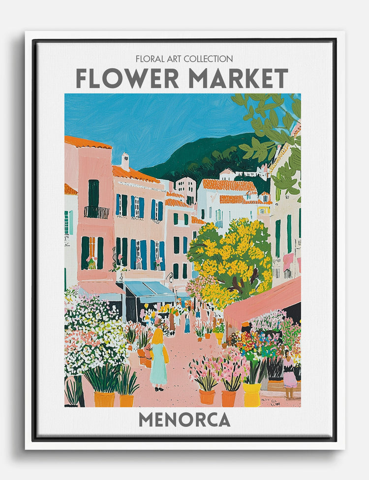 Step into the vibrant streets of Menorca with this stunning artwork that brings the lively energy of a flower market right into your home. Perfect for your living room or kitchen, this piece bursts with color and charm, making every day feel like a sunny escape to the Mediterranean. Let the harmonious blend of blues, pinks, and greens complement your decor while inspiring joy and self-expression.