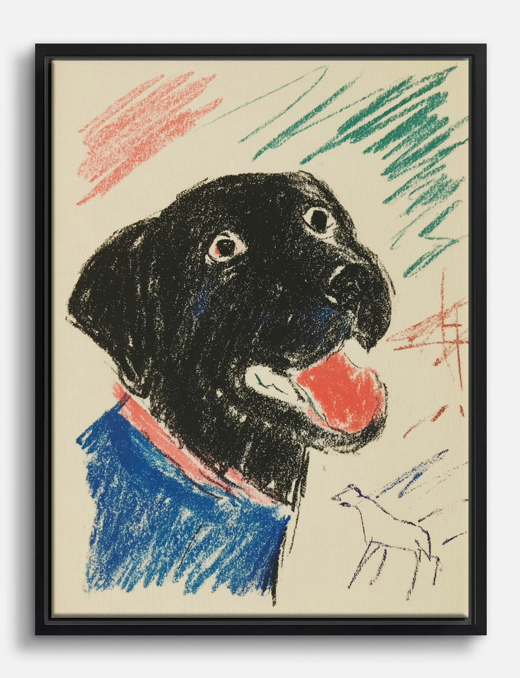 Meet the pup that instantly brings a smile to your walls. This hand-drawn black lab, tongue out and eyes wide with joy, captures that pure, tail-wagging energy every dog lover knows. The bold, expressive strokes and pops of red and blue create a playful vibe, making any room feel more welcoming and alive.
