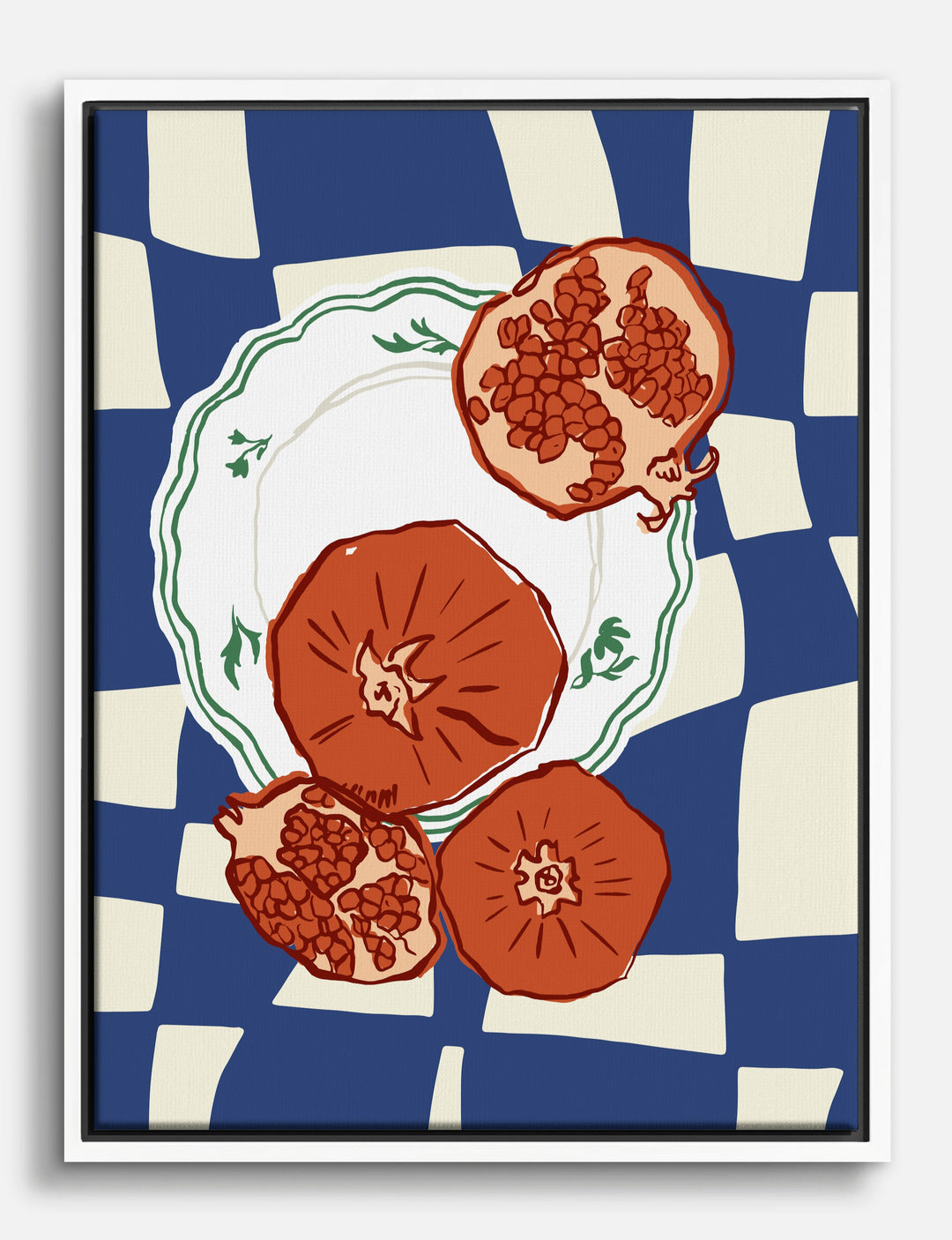 A pop of playful color for your kitchen or dining space, this lively print features bold pomegranates scattered atop a classic plate and a whimsically checkered blue-and-cream backdrop. It’s a celebration of everyday beauty, inviting you to savor the small joys and freshen up your walls with a vibrant, modern twist.